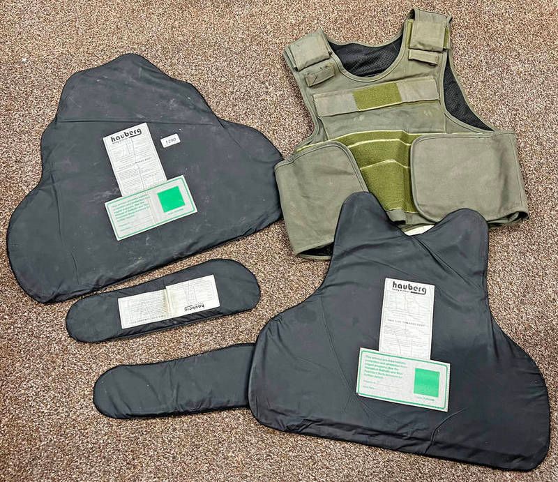 Two hauberg edged weapons balistic protection armour and two shoulder pads and a green overt body armour cover - display purposes only