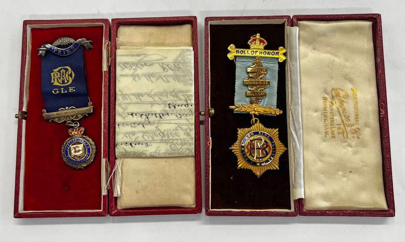 Silver enamel masonic medal from joseph westerby lodge no 1278 with presentation script and one other also presented to stanley surlees