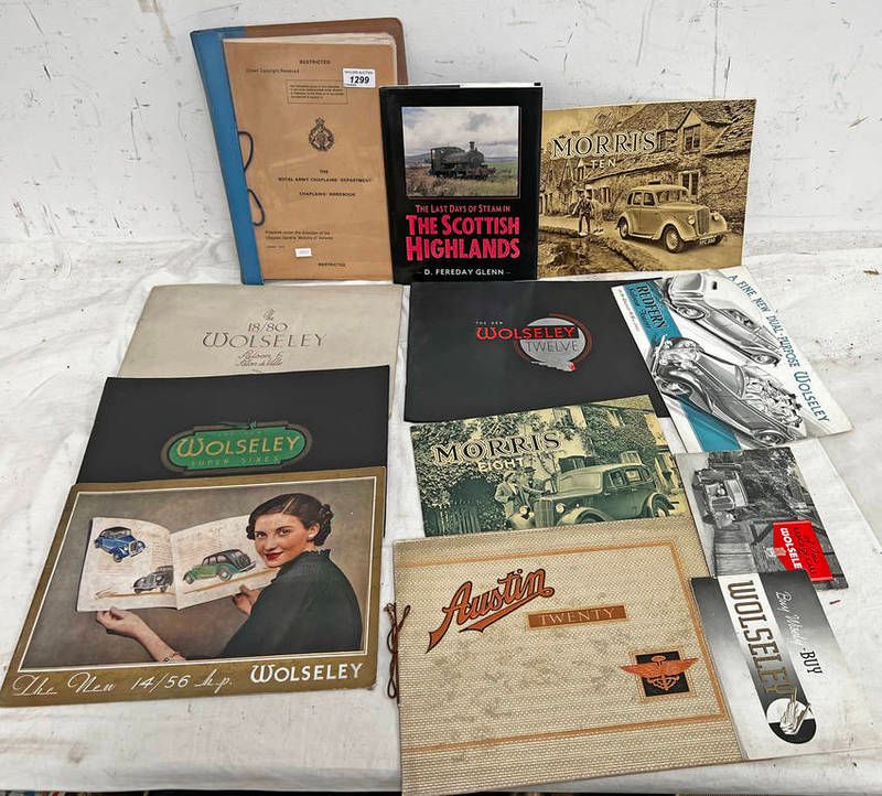 Vintage automotive and train ephemera to include wolseley catalogues, the 18/80 wolseley saloon & salon de ville catalogue, morris eight austin twenty, morris ten, wolseley twelve, wolseley super sixes, the last days of steam in the scottish highlands by fereday glenn etc.