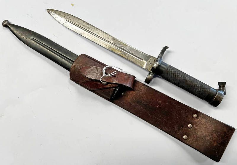 Swedish m1896 knife bayonet with 20.8 cm long blade with several markings with its steel scabbard and leather frog