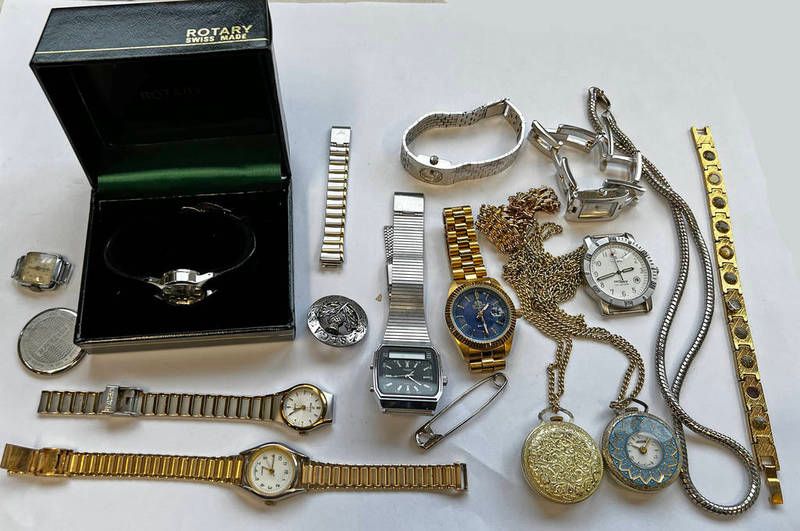 Wristwatches and pocket watches to include a rotary wrist watch in case, timex wristwatch, vantine pocket watch, astron ocean drive solar wristwatch etc.