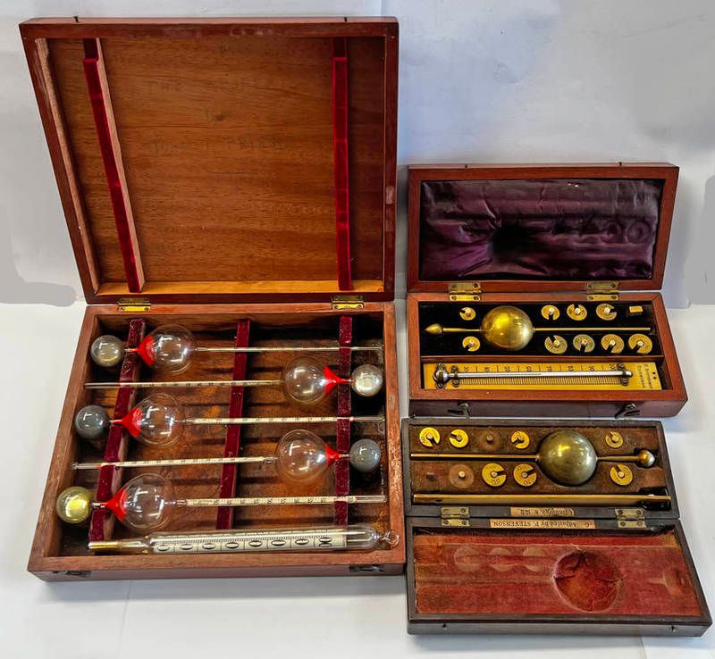 2 cased sikes hydrometers, one by bate poultry, london and the other by stevenso, edinburgh along with a cased set of 5 sikes glass hydrometers by peter stevenson, edinburgh