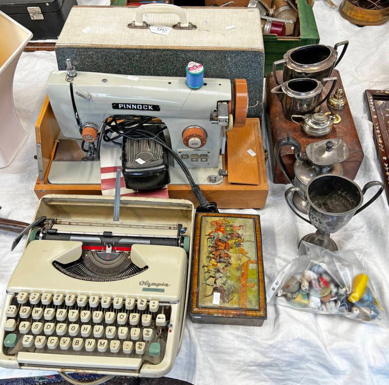 Pinnock sewing machine in case, epns ware, mackintosh tin box, typewriter in case, ornaments etc.