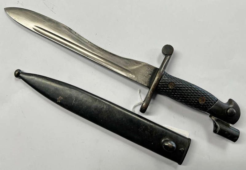Spanish m1941 bolo bayonet with 25 cm fullered steel blade marked ftn toledo, pommel with adapter for spanish m43 mauser rifle with steel scabbard