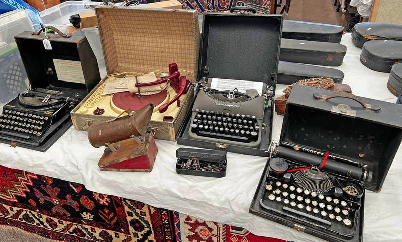 Remington home portable typewriter, underwood typewriter, remington typewriter, regneture record player, bellows etc
