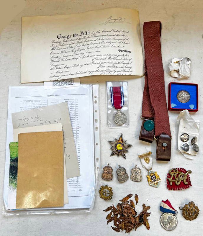 Medals and badges to include a grant of the dignity of a companion of the most eminent order of the indian empire to edward william perry, silver jubilee medal 1935, primrose league white metal and enamelled breast star, three silver arp badges, rough riders slouch hat badge, jubilee medallion, 1937 coronation medal, stewards breast jewel, raf buttons etc