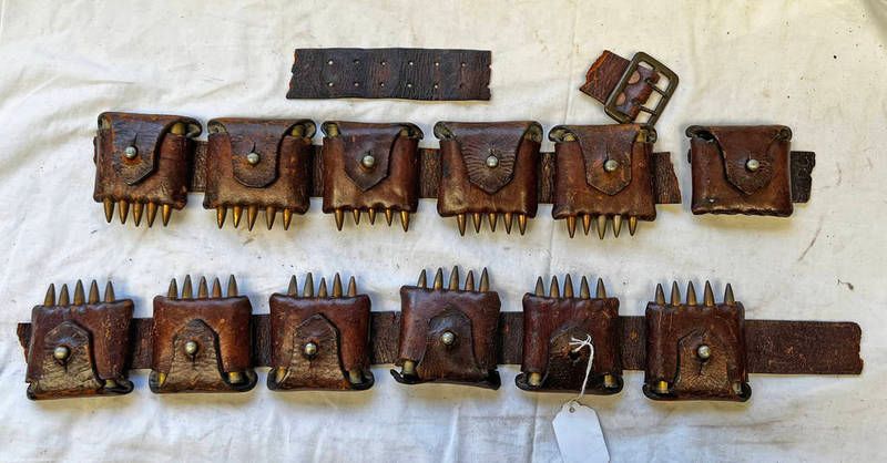 British boer war period leather twelve pocket ammunition bandolier, inert / de activated rifle rounds to interior