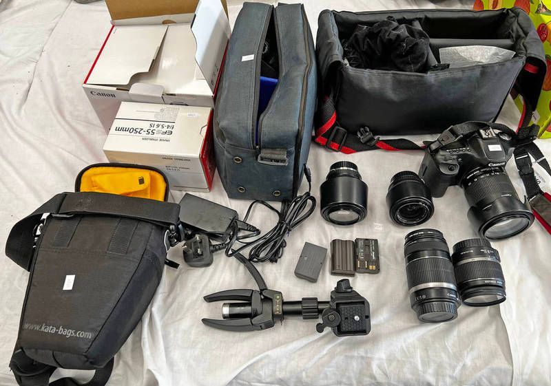 Canon eos 50d digital camera with canon 200m 18-135mm, canon 55-250mm lens, canon 18-55mm lens with jessops uv filer, sigma 70-210mm lens, sigma 28-70mm lens, cullmann tripod/stand batteries, boxes etc