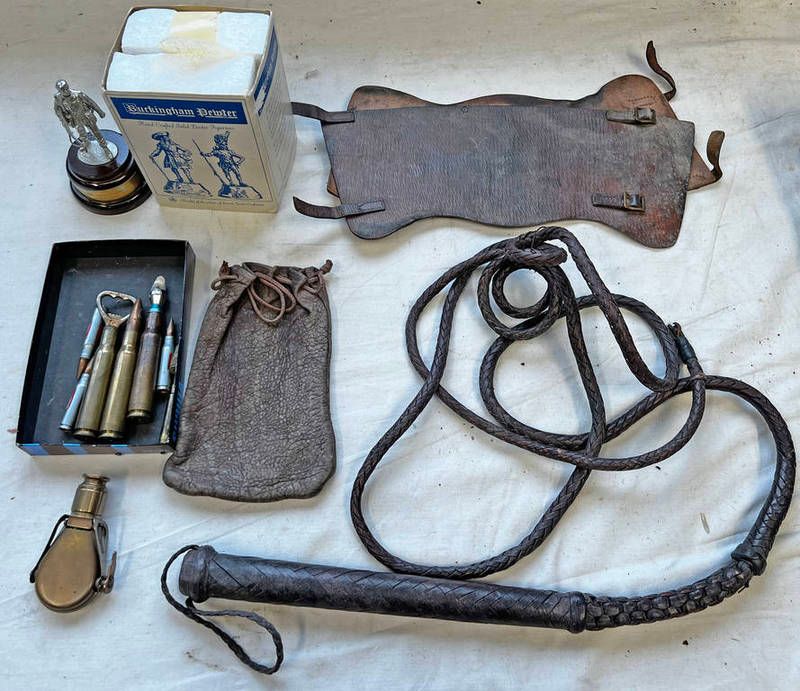 Militaria to include a leather bull whip, leather gaiters, cocktail set made from three l1142 brass cartridges, inert cartridges, military figures etc.