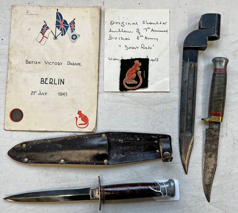 Ww2 7th armoured division ''desert rats'' cloth patch, william rodgers fighting knife in scabbard, no 9 knife bayonet and one other