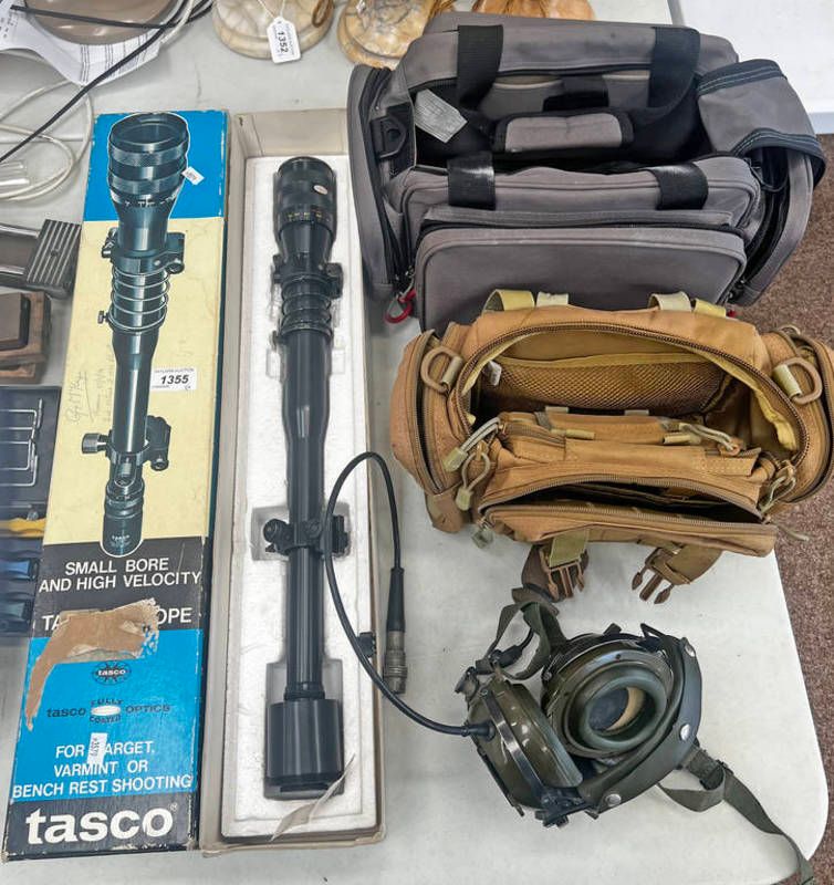 Tasco target scope in box, range maxx bag, 1 other bag & a head set -4-