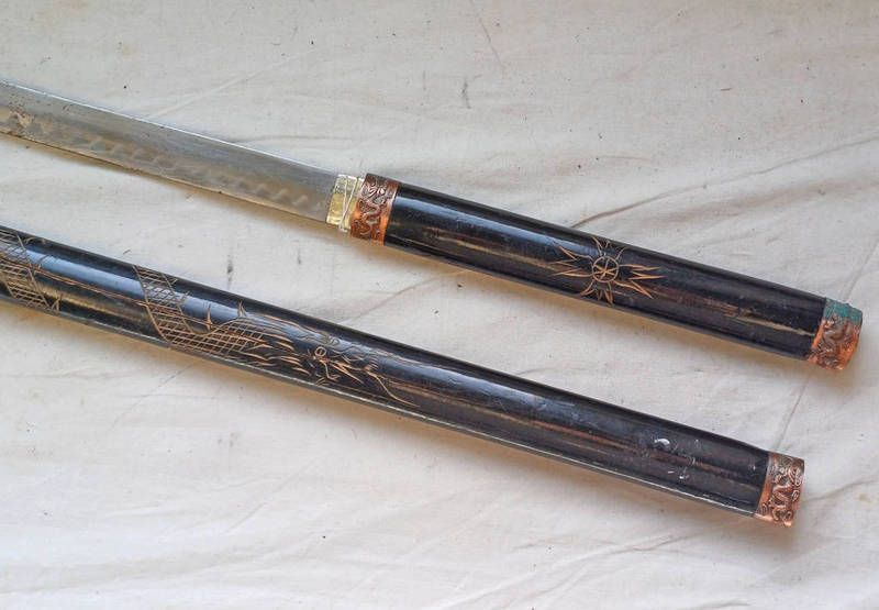 Japanese tachi type sword with 68 cm long blade with black lacquered grip and scabbard with dragon decoration