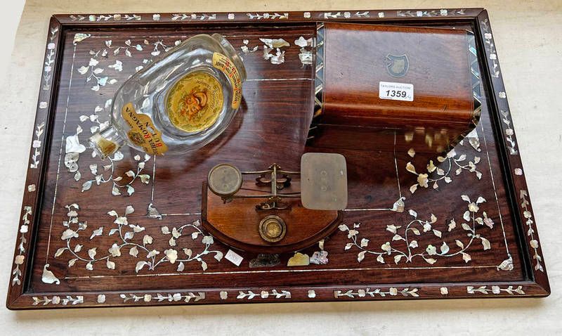 Mother of pearl inlaid tray, mother of pearl inlaid box, postage scales and a dimple bottle -4-