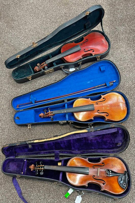 Three violins, all with 2 piece backs, one 33.5 cm and 2 x 34 cm...