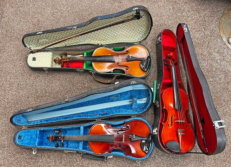 Three violins, all with 2 piece backs, one 33.5 cm and 2 x 34 cm long, one with interior label marked tatra by rosetti, all in cases -3-