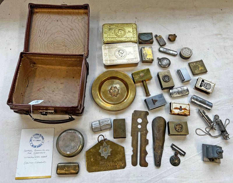 Ww1 and ww2 militaria to include 1914 christmas tin, raf match box holder, arp whistle, british military hudson whistle, control commission for germany interpreters group, lighters, coldstream guards plaque etc.