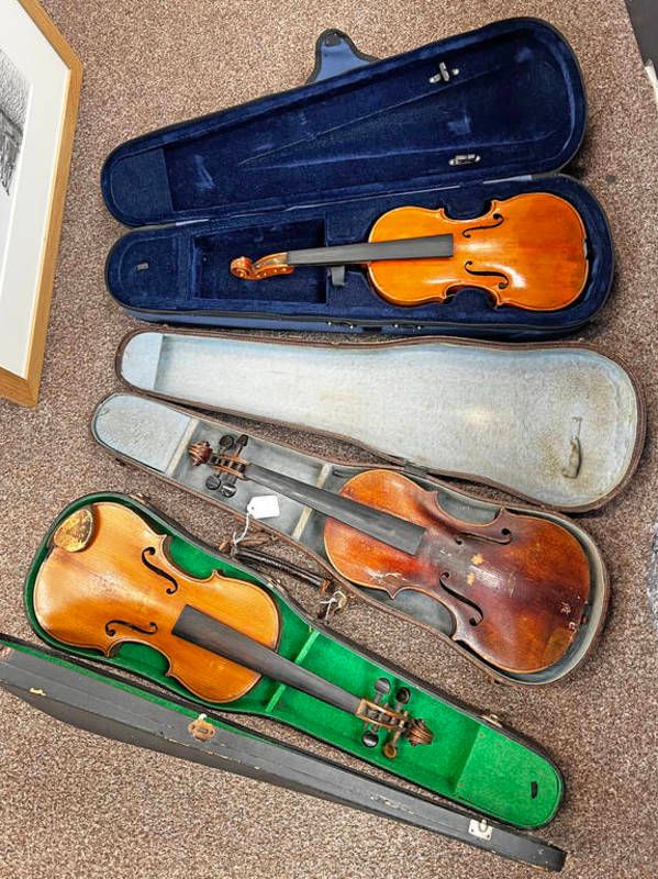 Three violins, all with 2 piece backs, one 33.5 cm and 2 x 34 cm...