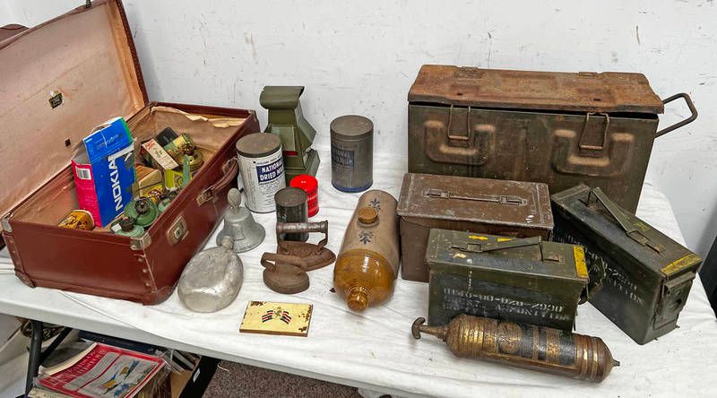 Militaria to include food ration and tobacco tins, aluminium victory bell, paraffin lamps, green ww2 period lantern, suitcases etc.