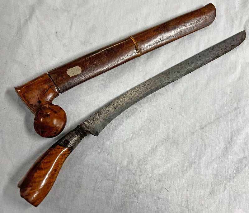 Sumatran tumbuk lada of characteristic form with 33cm long blade, engraved metal collar to the polished wood grip with its similar characteristic scabbard