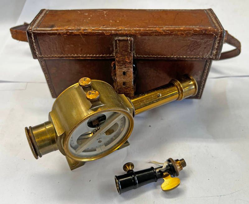 Brass level with 2'' glazed dial graduated from 0-90 degrees in 4 quadrants on 1 side & magnetic compass to other side in a leather case