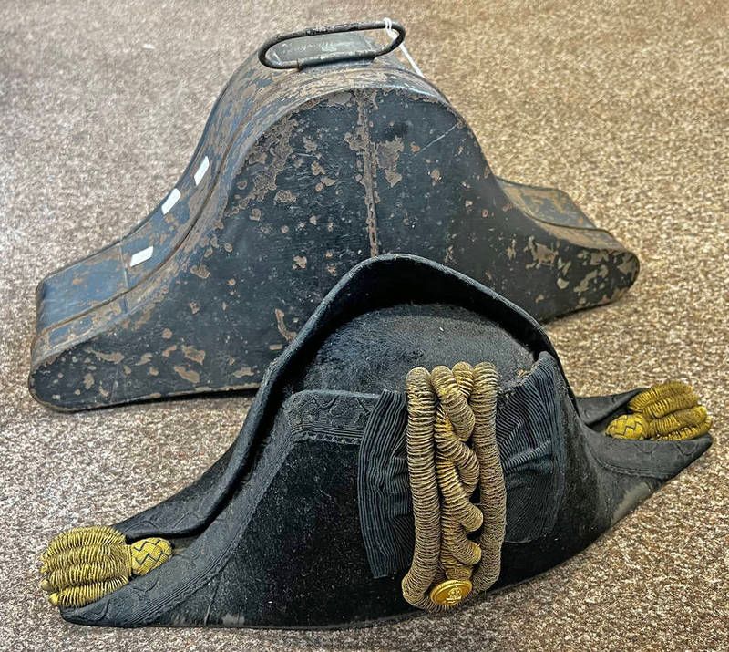 19th century bicorn hat by e a seagrove & co, portsea with bullion decoration in its metal tin with plaque marked w a hawkes rnr