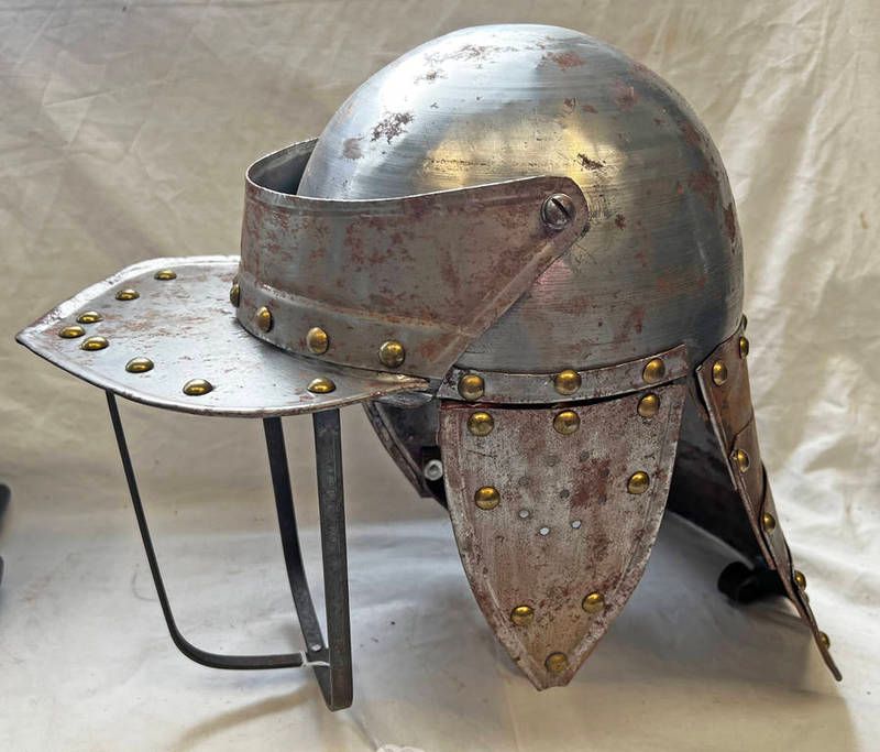 Reproduction english civil war style losbter pot helmet, steel construction with brass rivets & characteristic face guard & tail