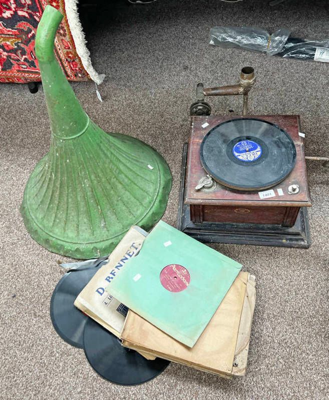 Gramophone player with horn and records