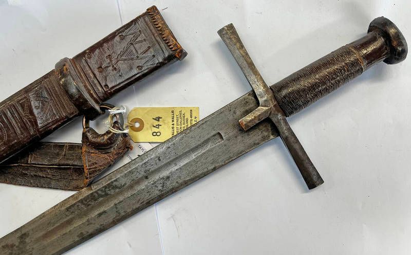 19th century sudanese kaskara with 89.7 long fullered broadsword blade, characteristic hilt with flattened faceted crossguard, disc pommel, bound grip with its worked leather scabbard