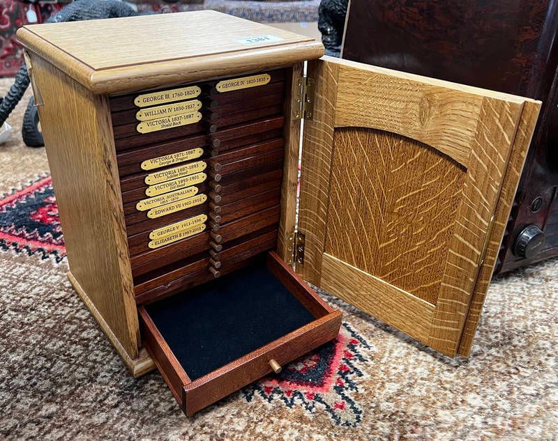Oak coin collectors cabinet, intended for sovereigns, with 18 x trays over large bottom drawer, with lock and key - 27 cm high x 20 cm wide x 17 cm deep