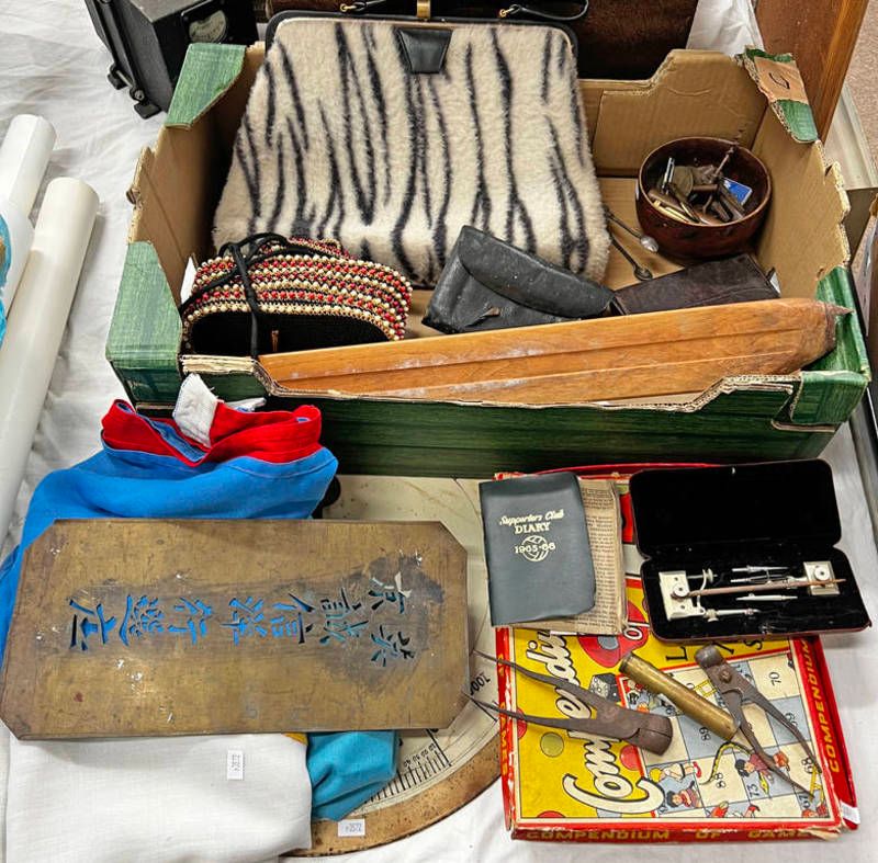 British military oiling bottle, lead musket ball moulds, w & j don & co brass disc/labels, 2 flags, raf badge, clock keys, cork screw, etc