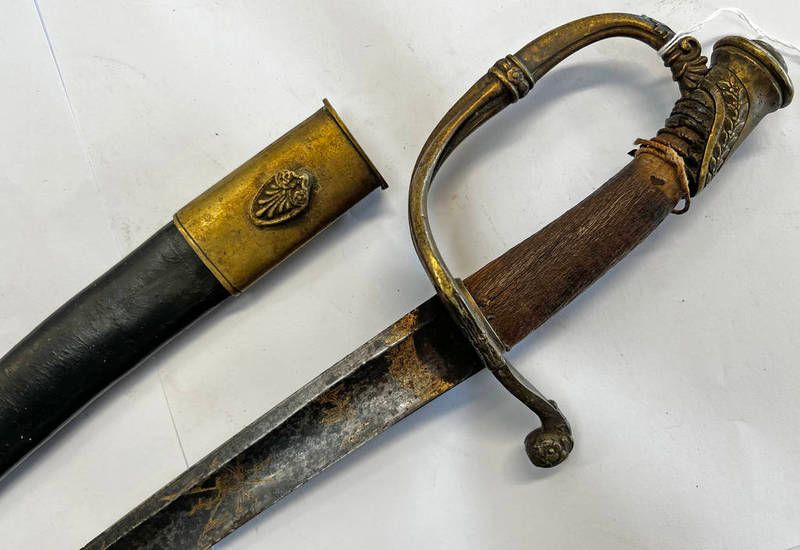 French 1st empire period officers sabre with 72.5cm long curved fullered blade decorated with stands of arms & gilt highlights, regulation brass hilt with d-shaped knuckle guard, wooden grip in its brass mounted leather scabbard
