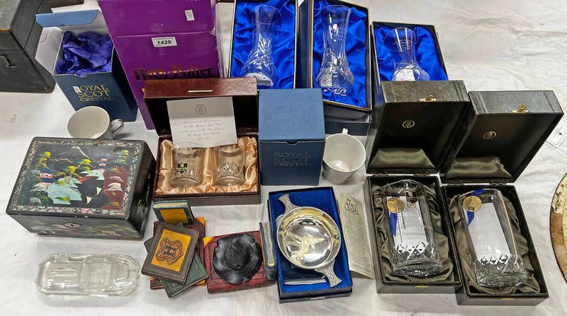 Caithness glass valley works brechin vase in box, edinburgh crystal 1977 queens silver jubilee boxed glasses, glass e-type jaguar paperweight, painted oriental music jewellery box, harry potter sorting hat bookend, etc