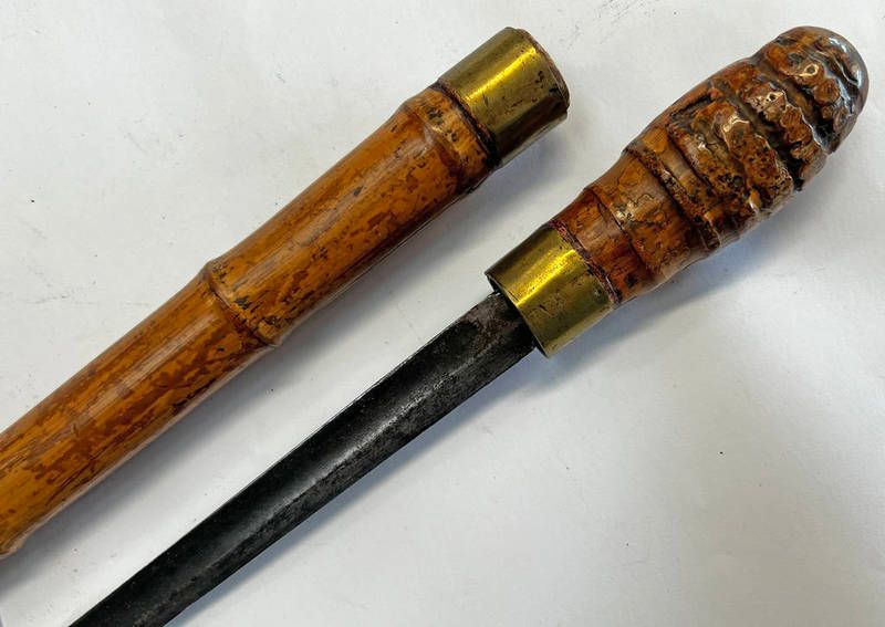 19th century slender bamboo sword stick with 56cm square section tapering blade, natural bamboo root...