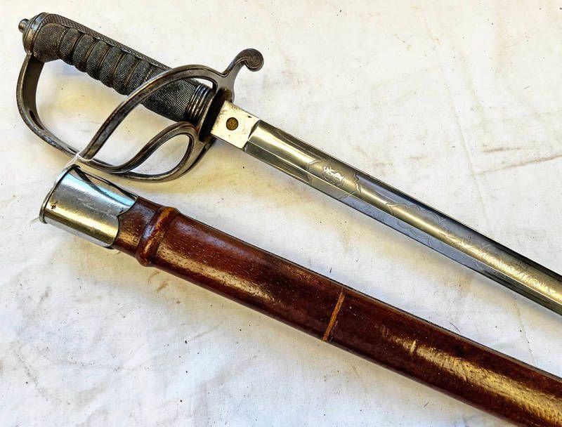 British 1821 pattern artillery officers sword to the 1st durham volunteer artillery, 83.5cm long single edged blade etched with original owners monogram, by w w white with wire bound grip & 3 bar hilt & its scabbard