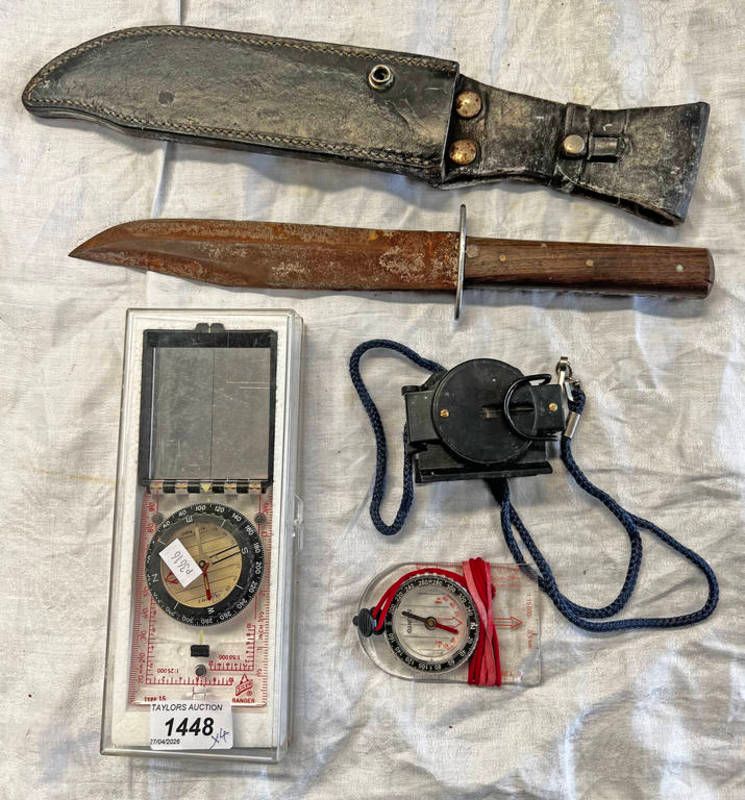 Bowie knife in sheath (af), silva sighting compass, suunto compass and one other -4-