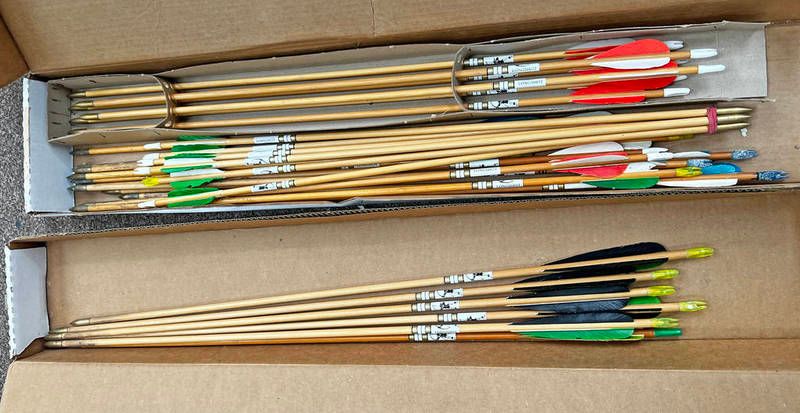 12 howard hill broad head tipped and wooden shafted arrows in box