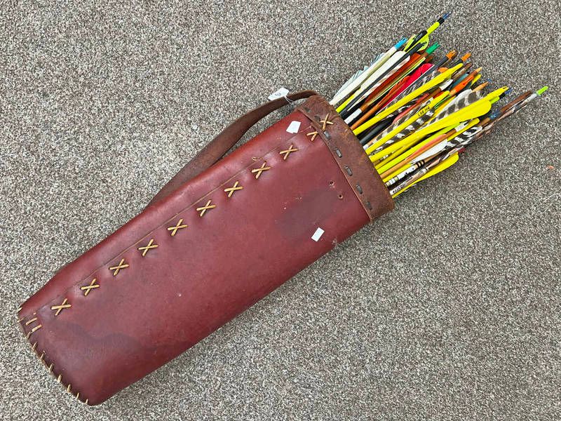 Leather quiver with a selection of various arrows