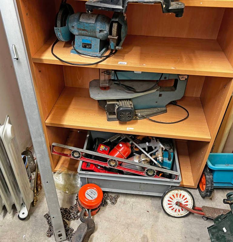 Bench grinder, scroll saw, tools to include battery saw, grease gun etc over 3 shelves