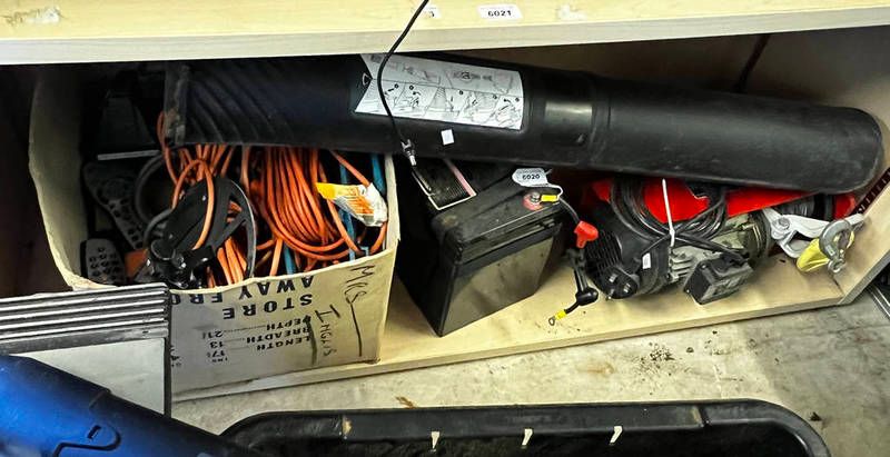 Bench grinder, scroll saw, tools to include battery saw, grease gun etc over 3 shelves