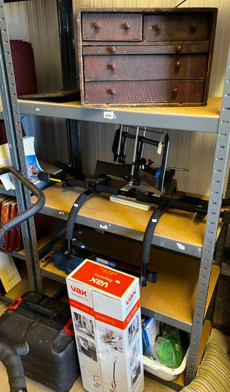 Wooden joiners multi drawer tool box with contents of various tools, pull up bar with record bench vice, vax steam glide etc