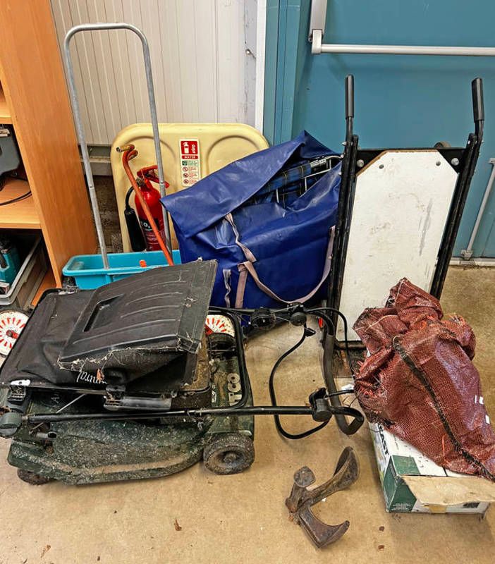 Flymo petrol lawn mower, garden tools to include a axe, rakes etc