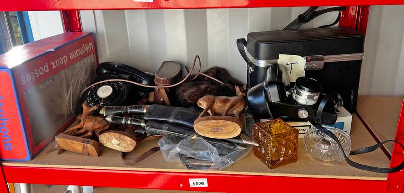 2 kukris, black rotary telephone, yashica electro 35 camera, fur hat, etc over one shelf