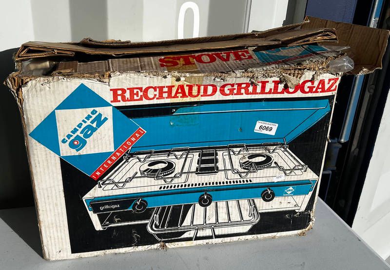 Creamola custard wooden box, iron stand, box camera, fire dogs, stoneware flagon's etc