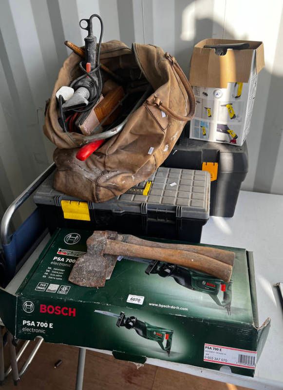 Tools to include 2 plastic tool boxes with various contents, karcher wv2 window vac, hatchets, bosch electric saw etc