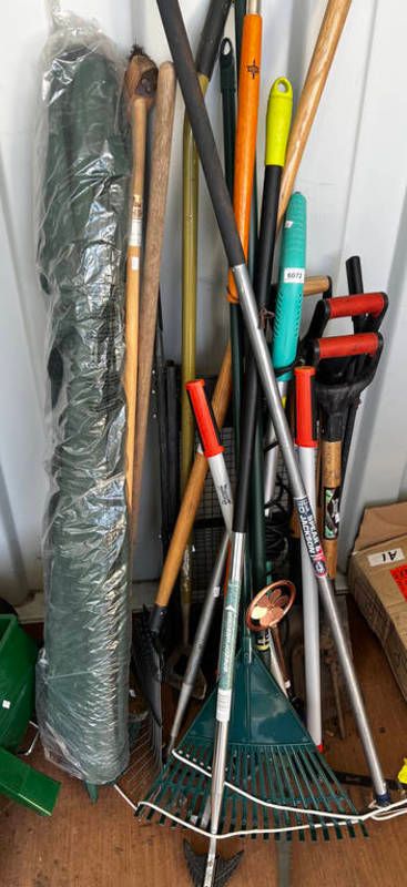 Good selection of garden tools to include rake, brushes, spades etc