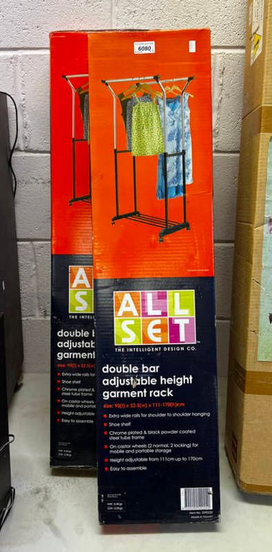 Two double bar adjustable height garment racks in boxes