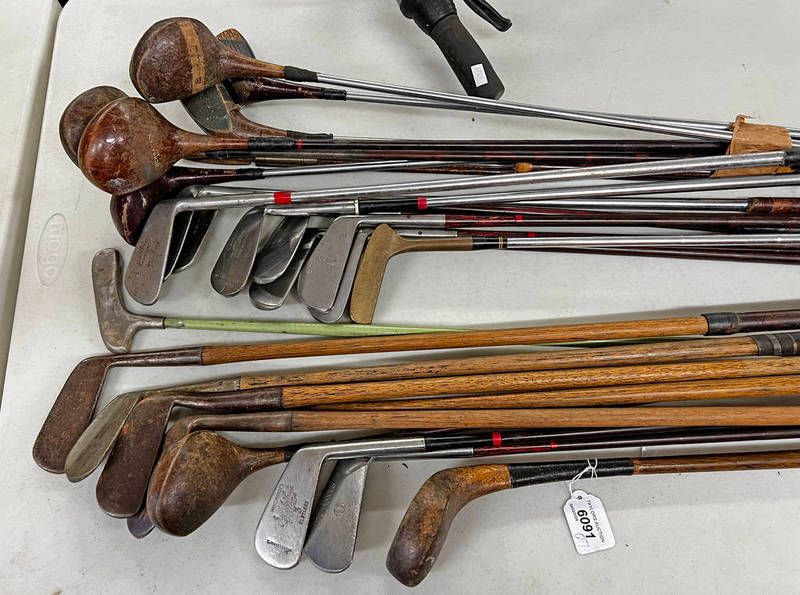 Selection of hickory and metal shafted golf clubs to include wry neck putter by tom fernie turnberry, hawkins mashie, anderson putter, short scared head putter etc