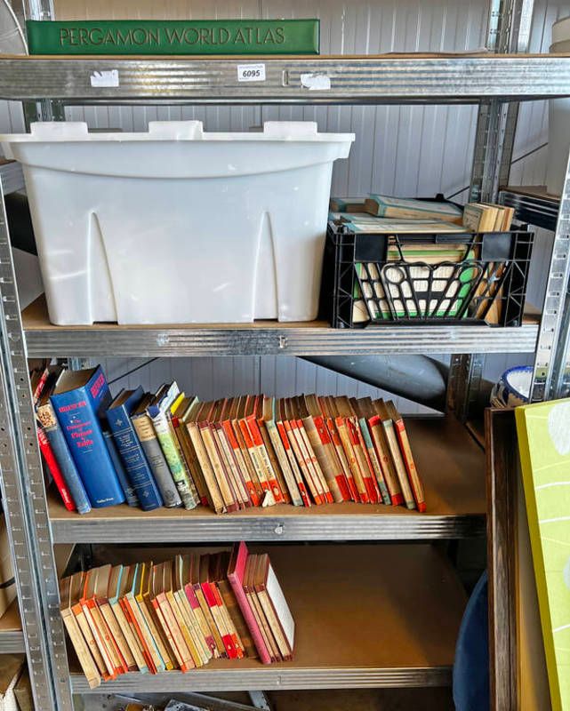 Selection of books to include various pelican books, penguin books, pergamon world atlas, etc over one shelving unit
