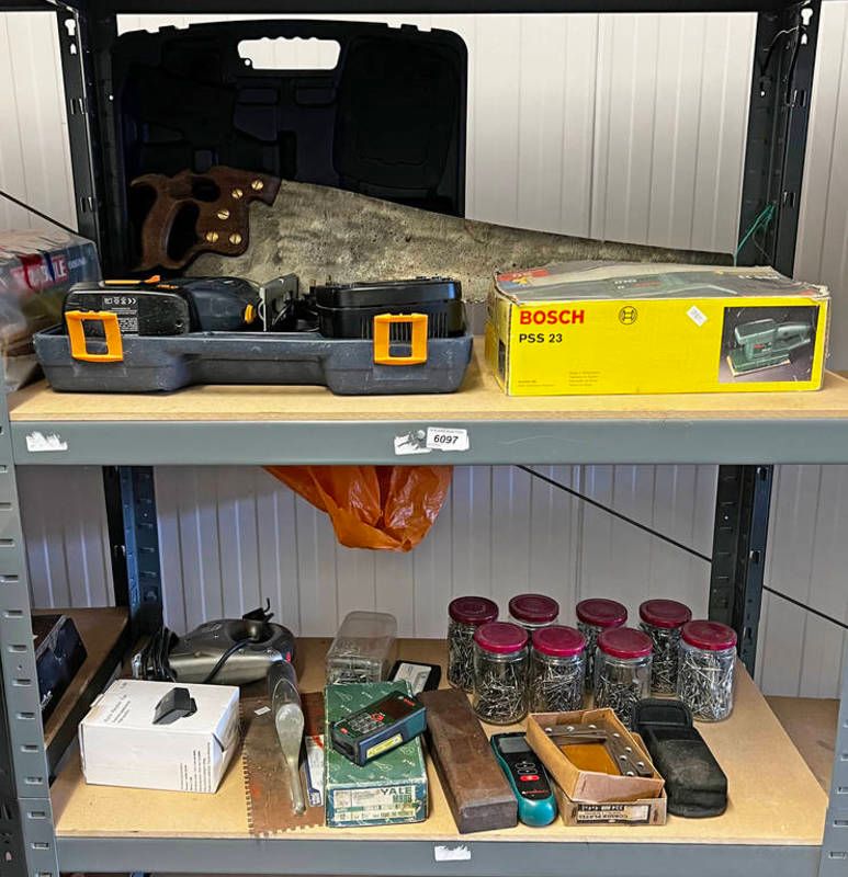 Tools to include bosch sander, jigsaw in case, bosch laser level, nails, fernex multi sensor, etc over 2 shelves