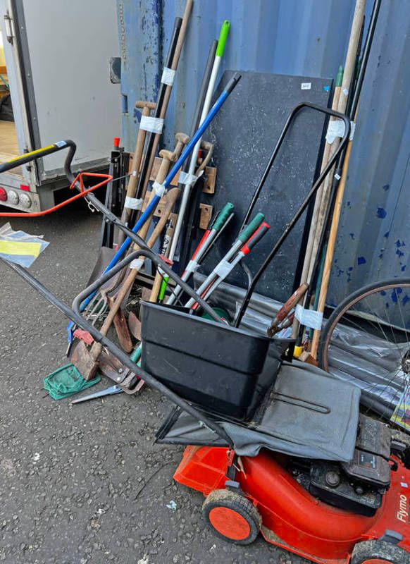 Flymo petrol lawn mower, garden tools to include a axe, rakes etc